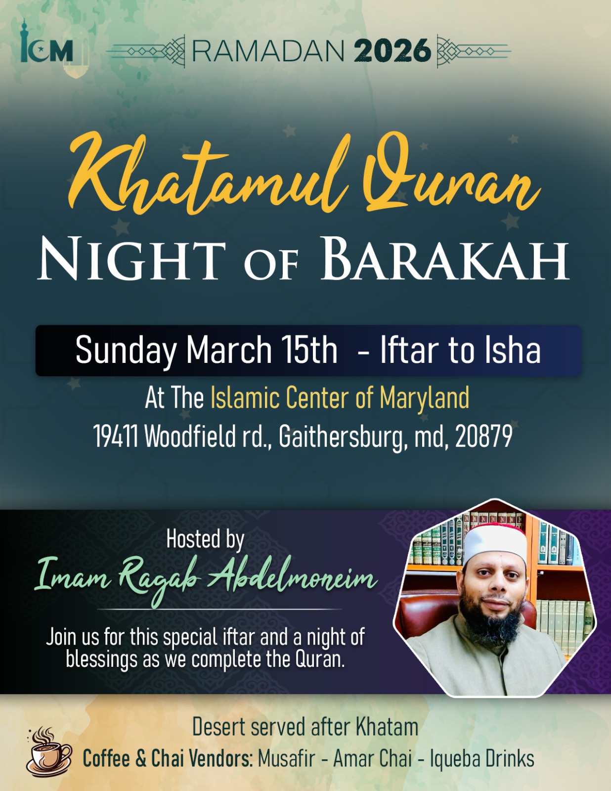 The Islamic Center of Maryland (ICM) is a 501-C3 non-profit organization with an operational philosophy based on the Holy Qur’an and the teachings of Prophet Muhammad (peace be upon him). Muslim families who visit ICM work toward fulfilling their religious obligations and striving for spiritual, intellectual, social and economic well-being. The Center strives to build a working relationship with people of all faiths to promote understanding, tolerance, and activism that benefits all. For more information about services and programs, please visit the Center, subscribe to our weekly newsletter or submit a Contact Us request