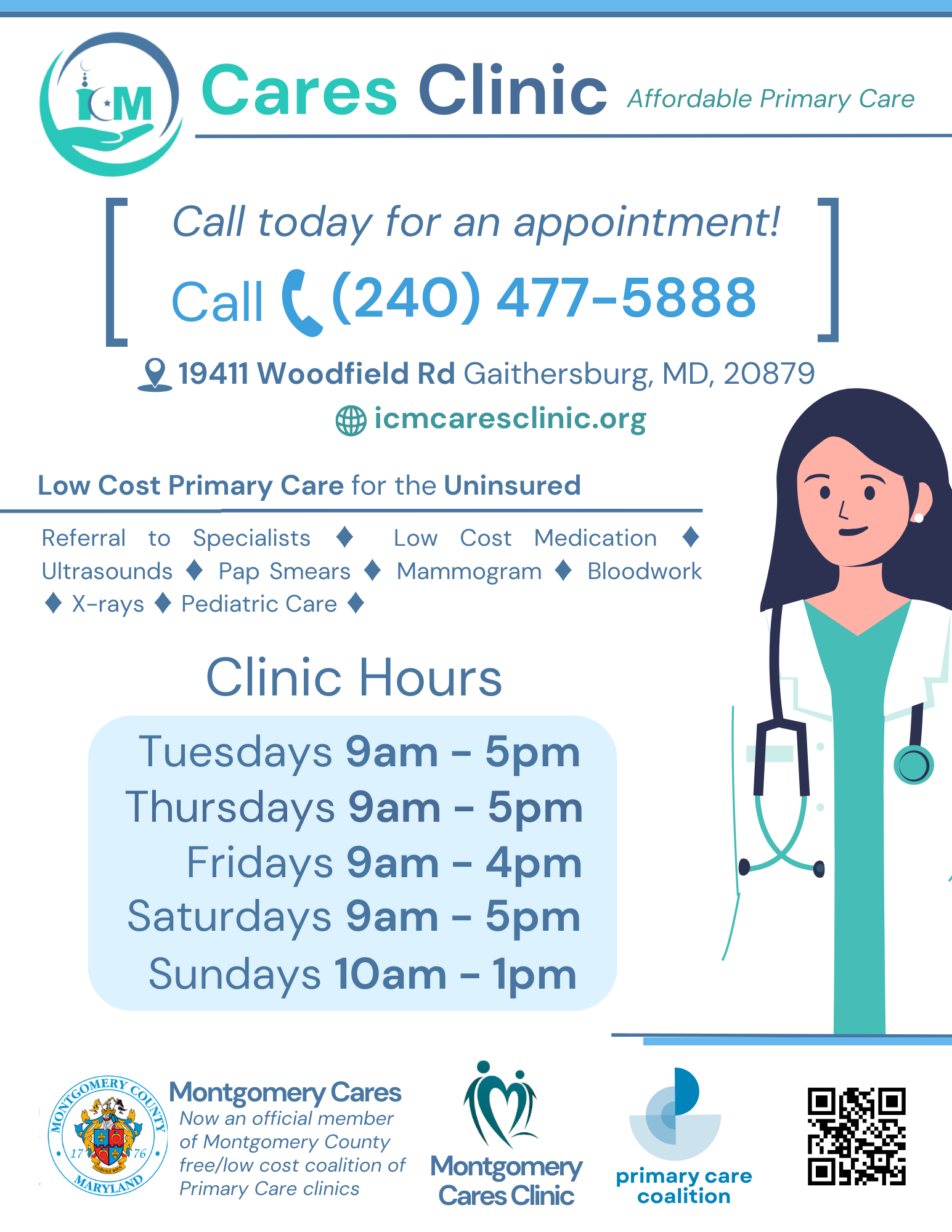 ICM Cares Clinic was founded in 2022 in the aftermath of the COVID-19 Pandemic. Our founders recognized massive unmet healthcare needs in Montgomery County and decided a new clinic was needed to service the underrepresented and underinsured.